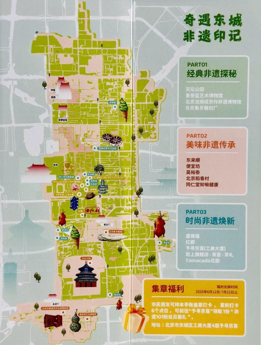 开幕仪式现场发布了“奇遇东城 非遗印记”非遗促消费打卡计划,打造非遗与文旅消费深度融合的鲜活场景。记者了解到,“奇遇东城 非遗印记”非遗促消费打卡计划将通过“经典非遗探秘”“非遗美味传承”“非遗时尚焕新”三类非遗点位,串联起天坛公园、景泰蓝艺术博物馆、稻香村零号寻宝馆等文化地标。活动期间,“非遗101”公众号将推送东城区遗产日活动预告,在推文末尾将设置互动板块。读者留言区回复预约口令,即可在北京稻香村零号寻宝馆线下领取手账一份。手账中将刊登非遗点位的“专属福利优惠”,市民凭借手账前往现场打卡集章,即可解锁专属“奇遇好礼”,在该点位领取相应优惠福利。此外,市民朋友累计打卡6个点位,可前往工美大厦“予寻京喜”空间领取“非遗101粉丝见面礼”。