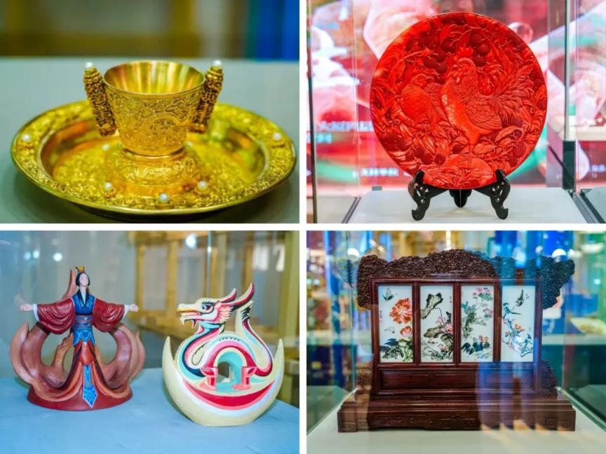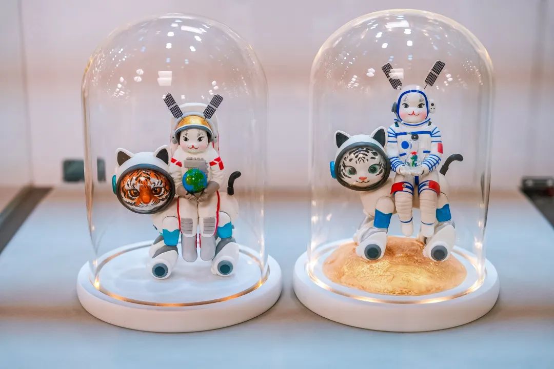 东城区青年代表性传承人创新作品及非遗主题文创,体现了非遗元素与现代设计、科技、时尚的创造性结合。雕漆技艺区级传承人李根的作品《盛世鸿福如意》,将景泰蓝、玉雕、雕漆和花丝镶嵌四大中国非遗工艺有机融合,通过深契在中华民族心中独具喜庆吉祥寓意的如意,表达对盛世祖国的美好祝福;“面人彭”创始人彭小平之女、区级非遗传承人彭天的作品《兔爷探月》,融合传统面塑技艺与未来幻想,塑造了兔爷身着宇航服、驾驭AI机械虎的奇幻形象,展现传统与现代共生的无限可能。